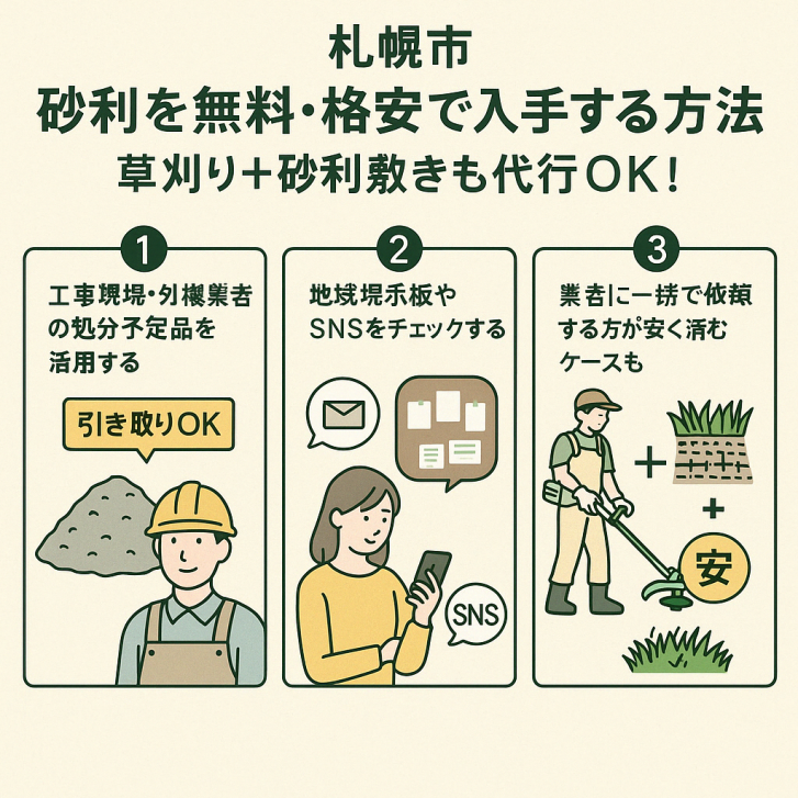 こうした「コスト」「再発防止」「業者探し」に悩んでいる方のために、今回は札幌市で砂利を無料・格安で入手する方法を徹底解説。草刈り+砂利施工の代行についてもご紹介します!